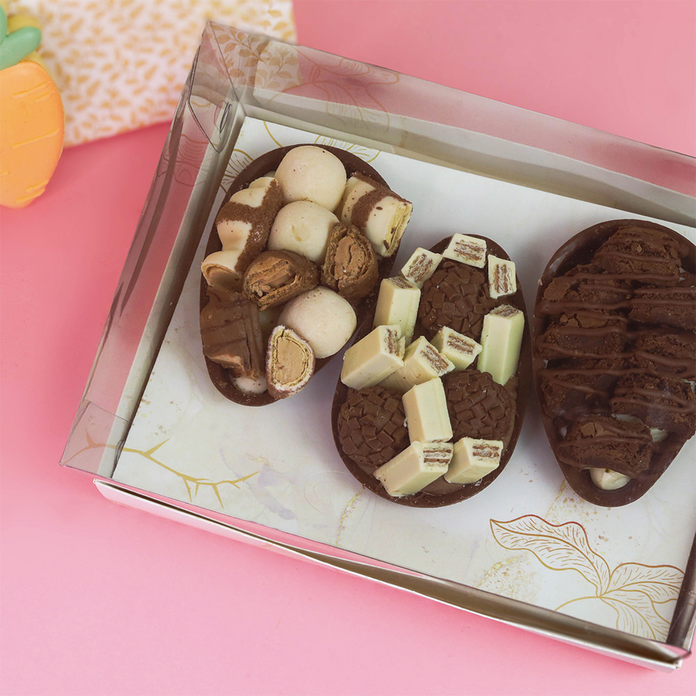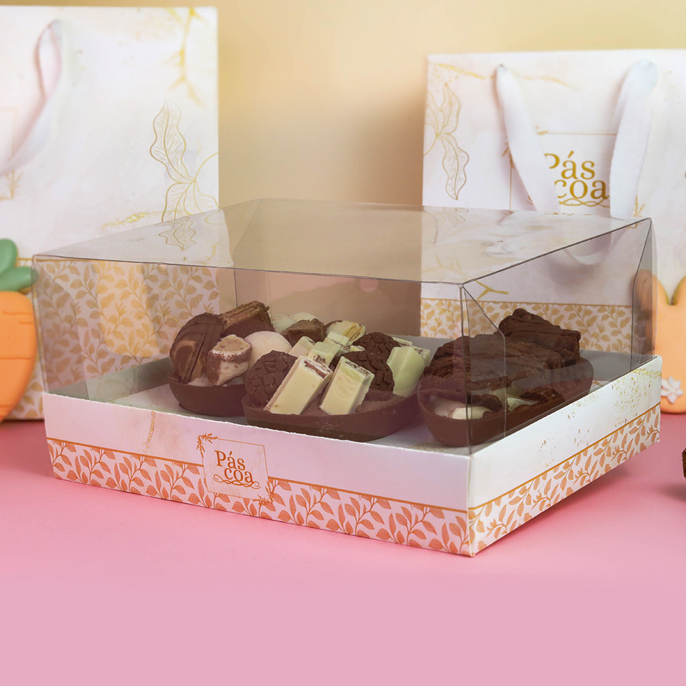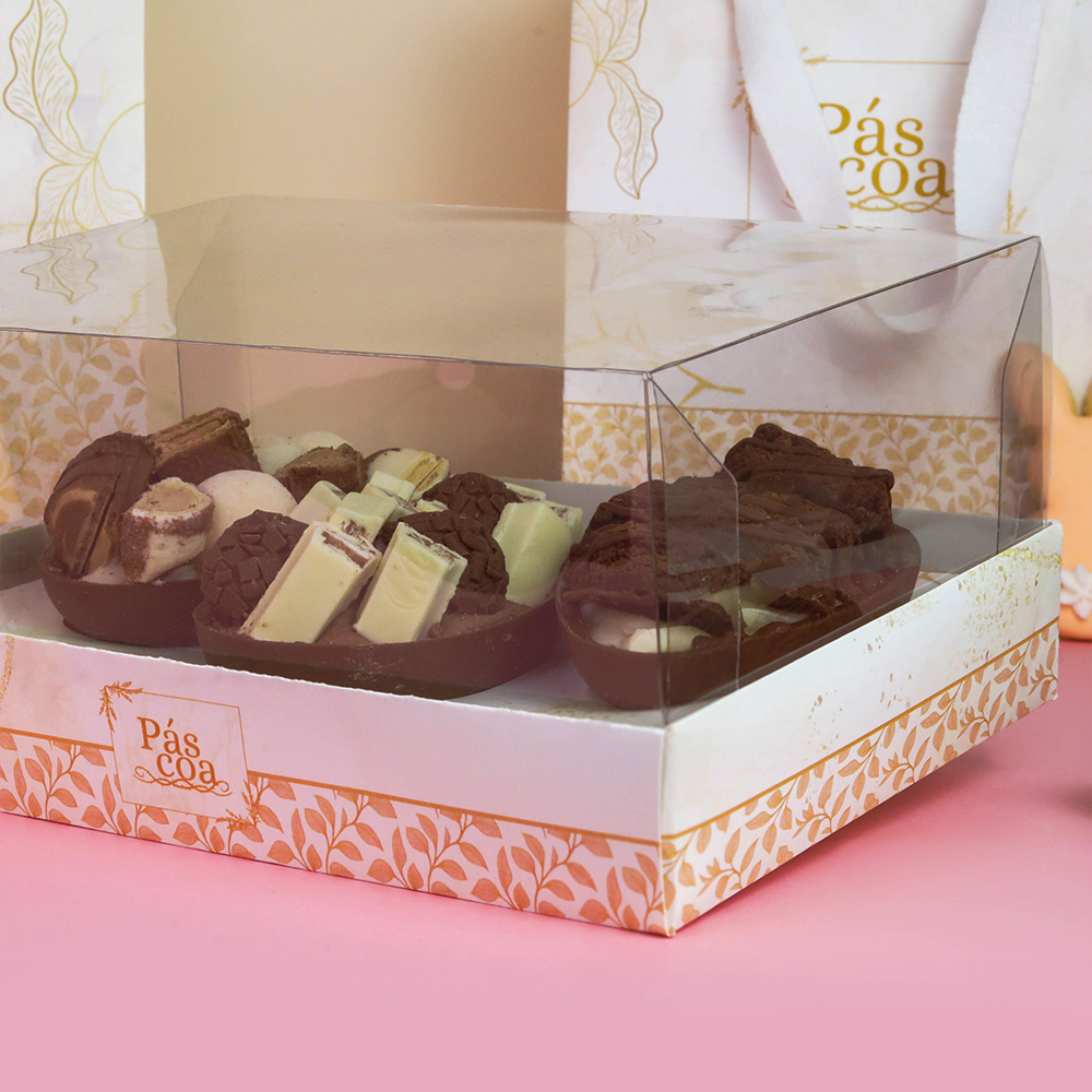 O Berço desta embalagem poderá acomodar 3 unidades de cascas de chocolate que você pode utilizar para aquele cliente indeciso que nunca consegue se decidir por 1 sabor só, você também pode utilizar esta embalagem para criar kits de sabores que se relacionem e recheios que possam ser servidos juntos ou complementares.