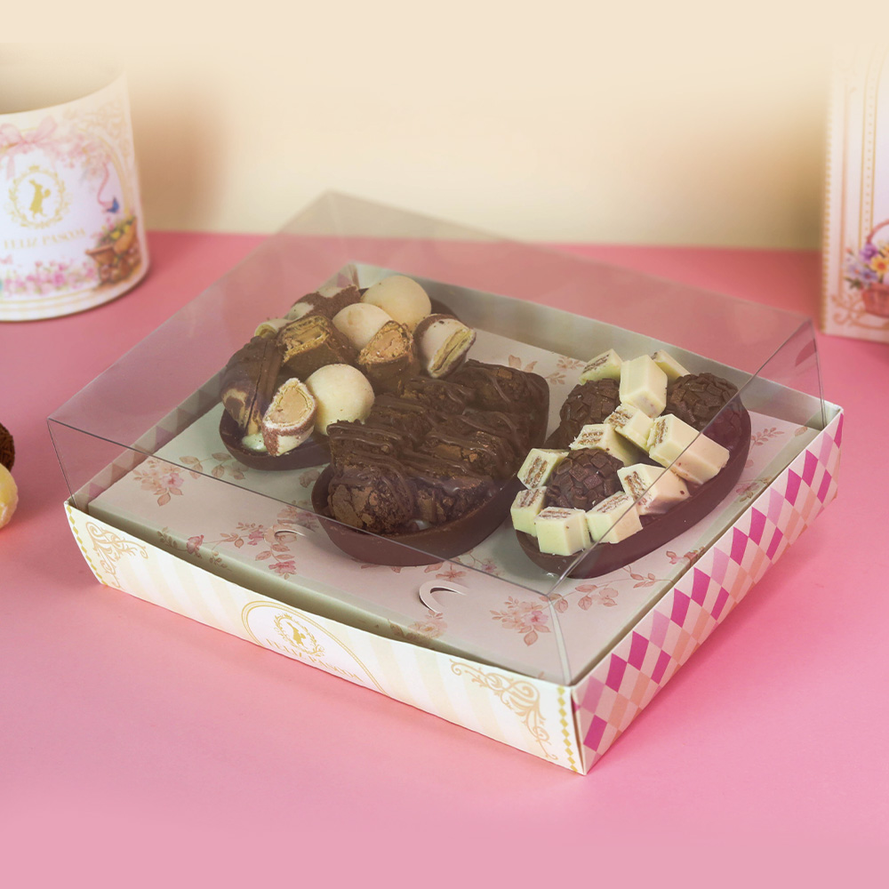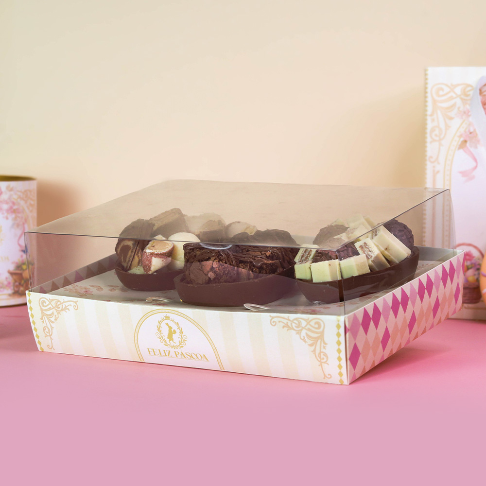 O Berço desta embalagem poderá acomodar 3 unidades de cascas de chocolate que você pode utilizar para aquele cliente indeciso que nunca consegue se decidir por 1 sabor só, você também pode utilizar esta embalagem para criar kits de sabores que se relacionem e recheios que possam ser servidos juntos ou complementares.