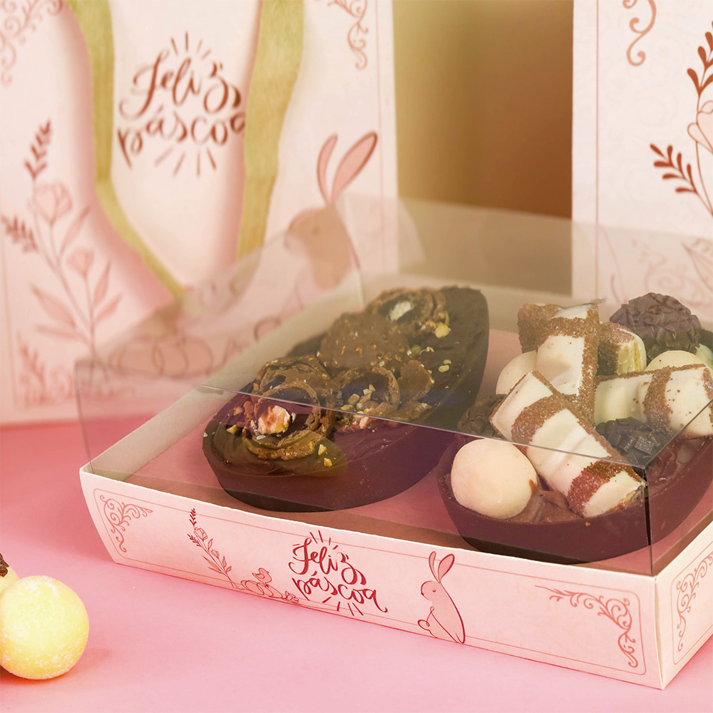 Pensada e desenvolvida para acomodar Ovos de Colher ou Ovos Gourmet esta embalagem pode receber 2 unidades de ovos de 250gr.