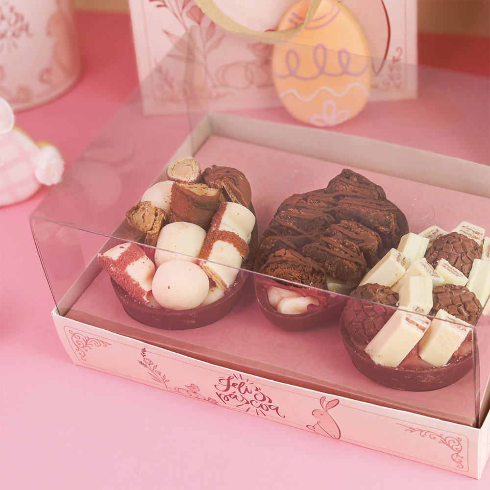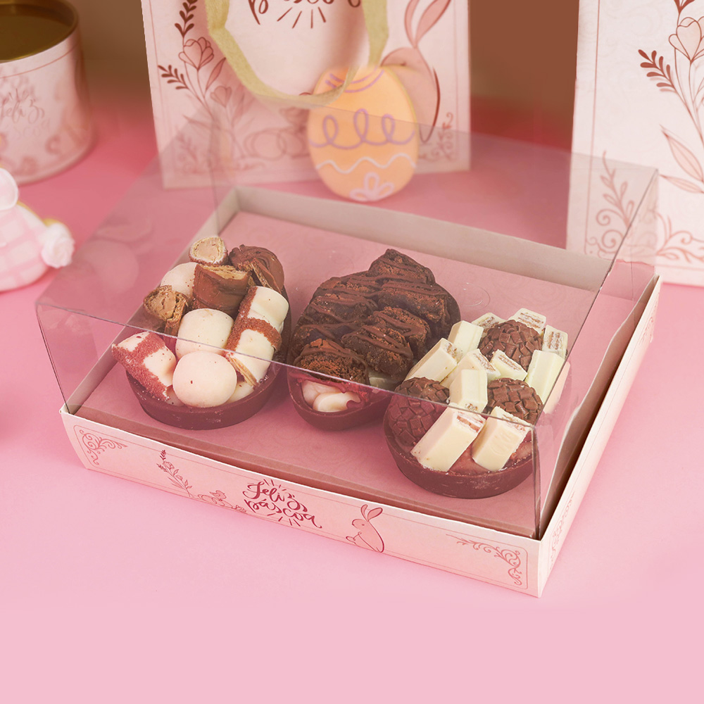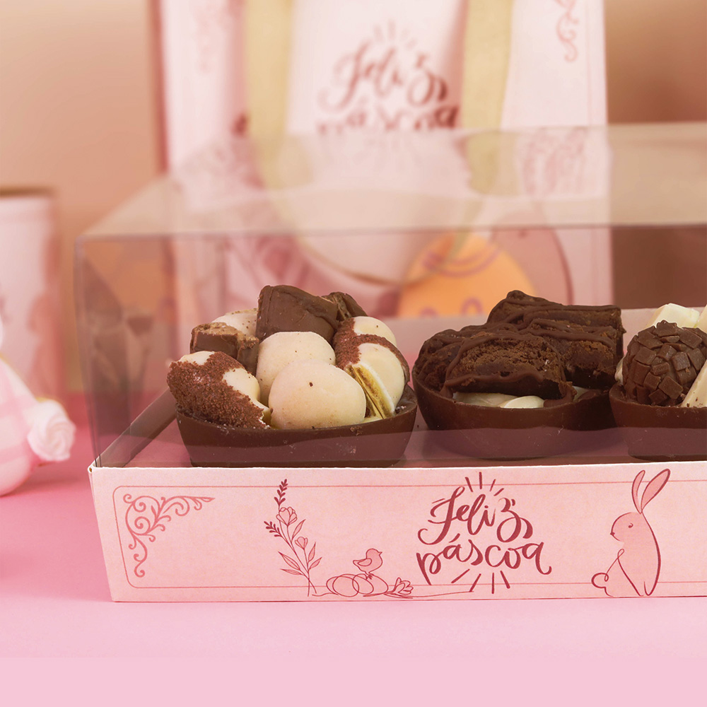 O Berço desta embalagem poderá acomodar 3 unidades de cascas de chocolate que você pode utilizar para aquele cliente indeciso que nunca consegue se decidir por 1 sabor só, você também pode utilizar esta embalagem para criar kits de sabores que se relacionem e recheios que possam ser servidos juntos ou complementares.