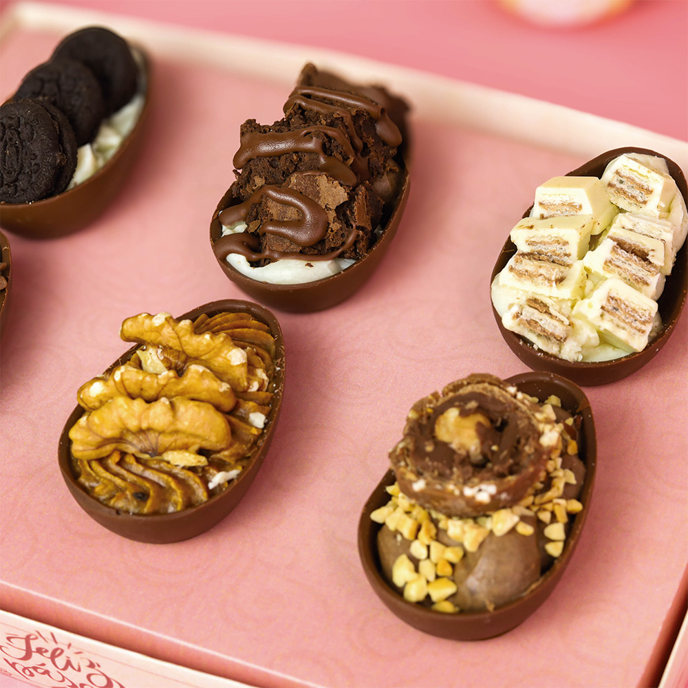 O Berço desta embalagem acomoda 6 Mini ovos de colher de 50gr.