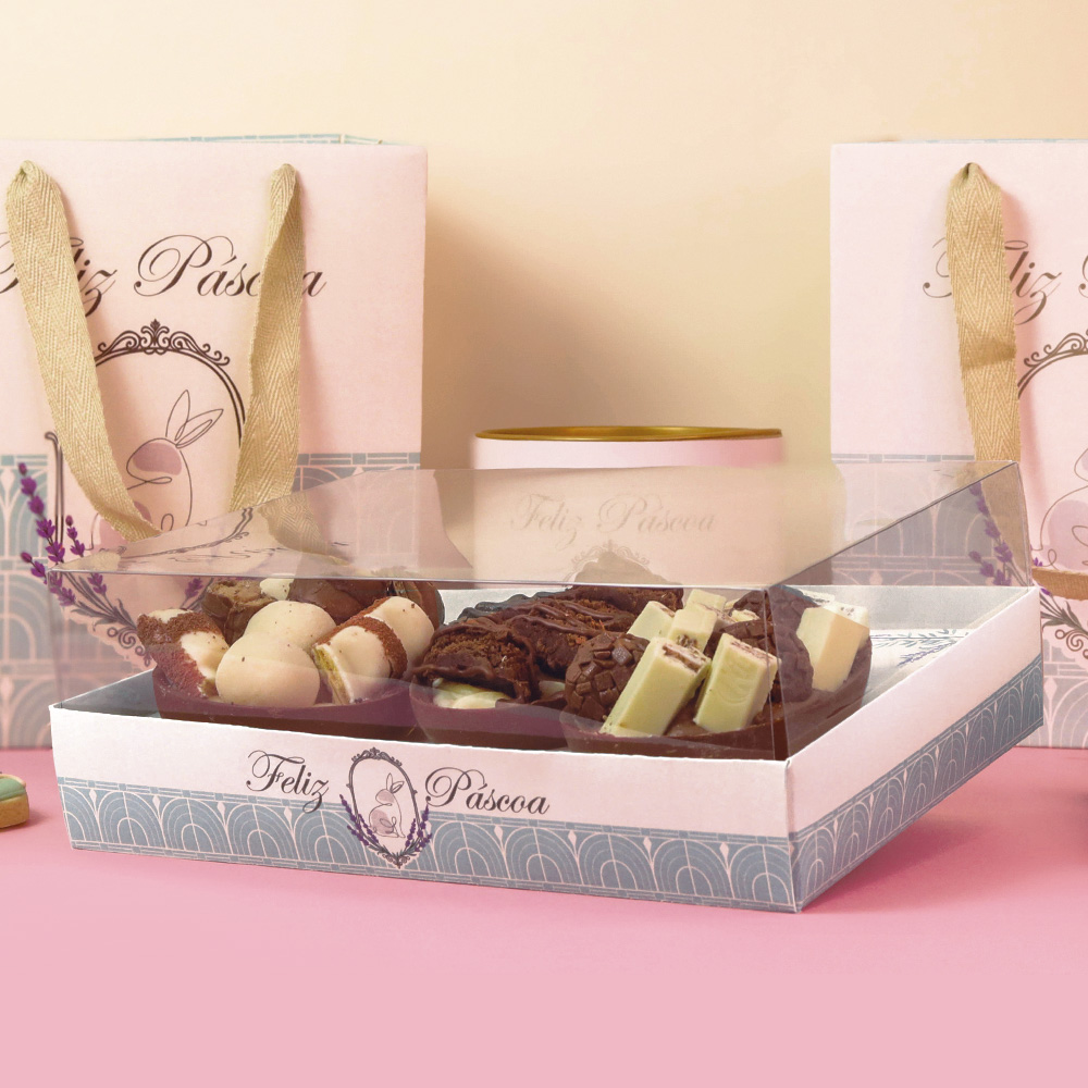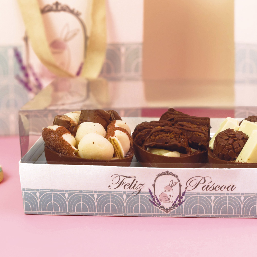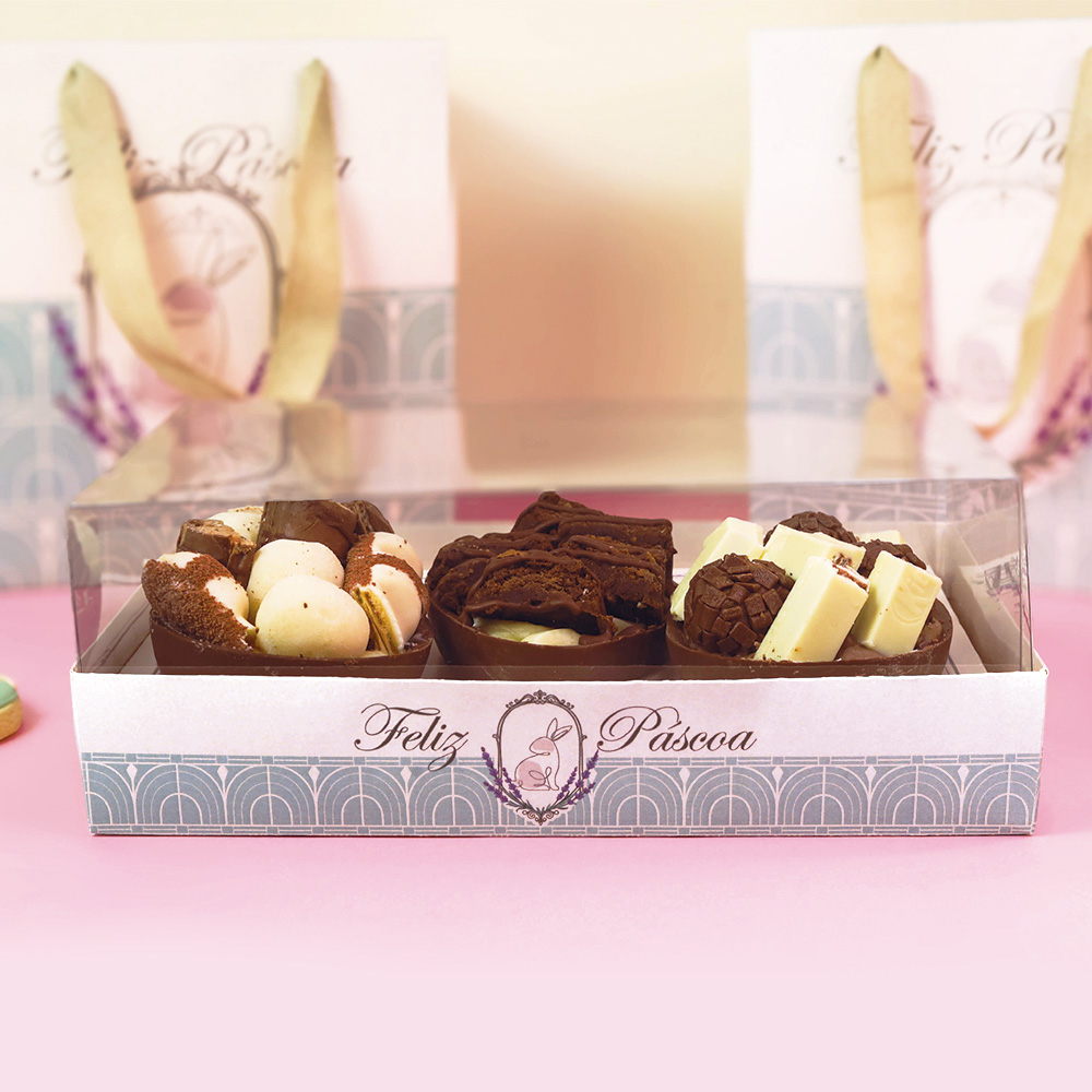 O Berço desta embalagem poderá acomodar 3 unidades de cascas de chocolate que você pode utilizar para aquele cliente indeciso que nunca consegue se decidir por 1 sabor só, você também pode utilizar esta embalagem para criar kits de sabores que se relacionem e recheios que possam ser servidos juntos ou complementares.