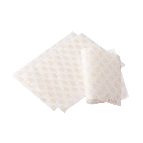 O material é um papel especial, com barreira para gordura, resistente, não rasga facilmente com umidade e não gruda no alimento.